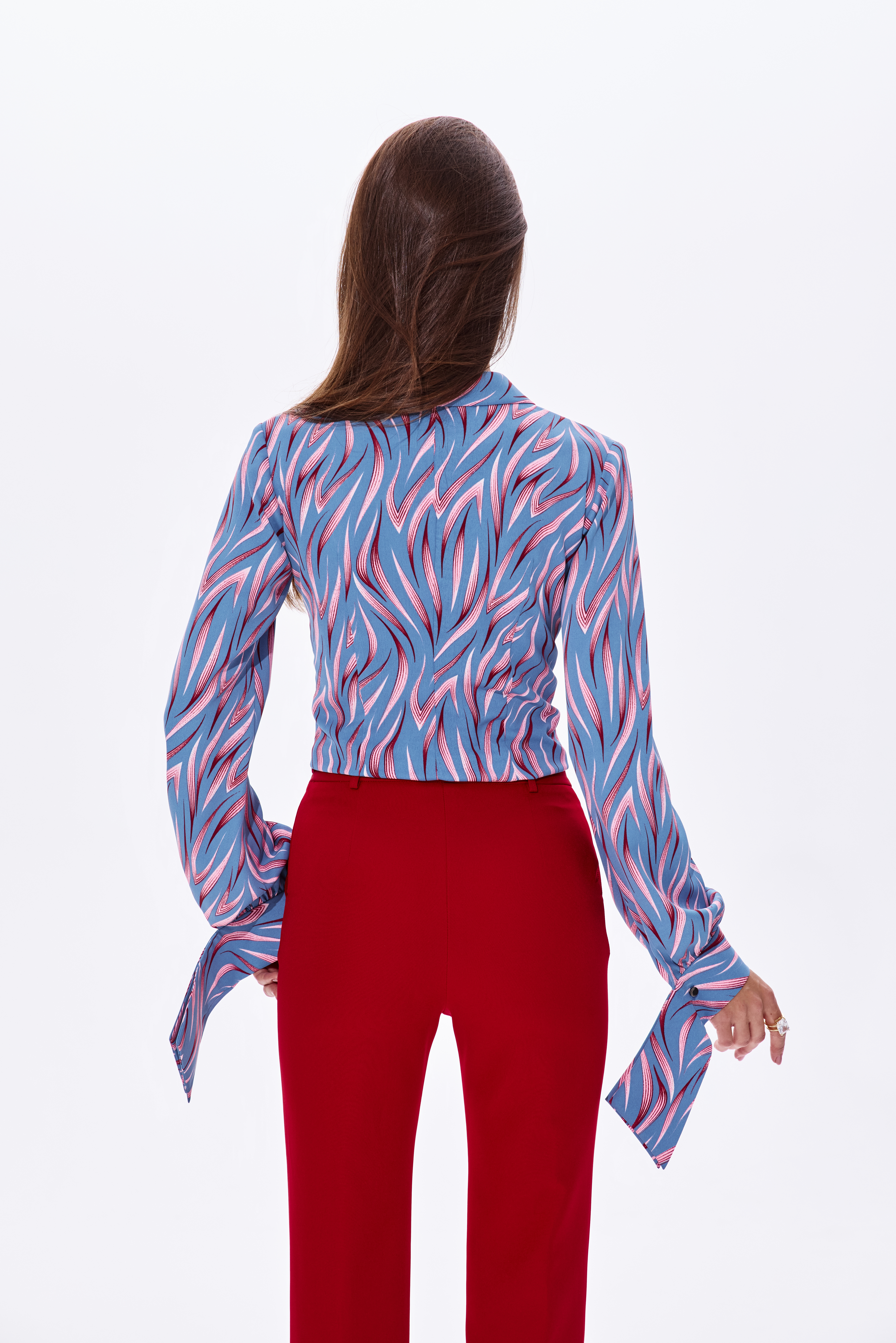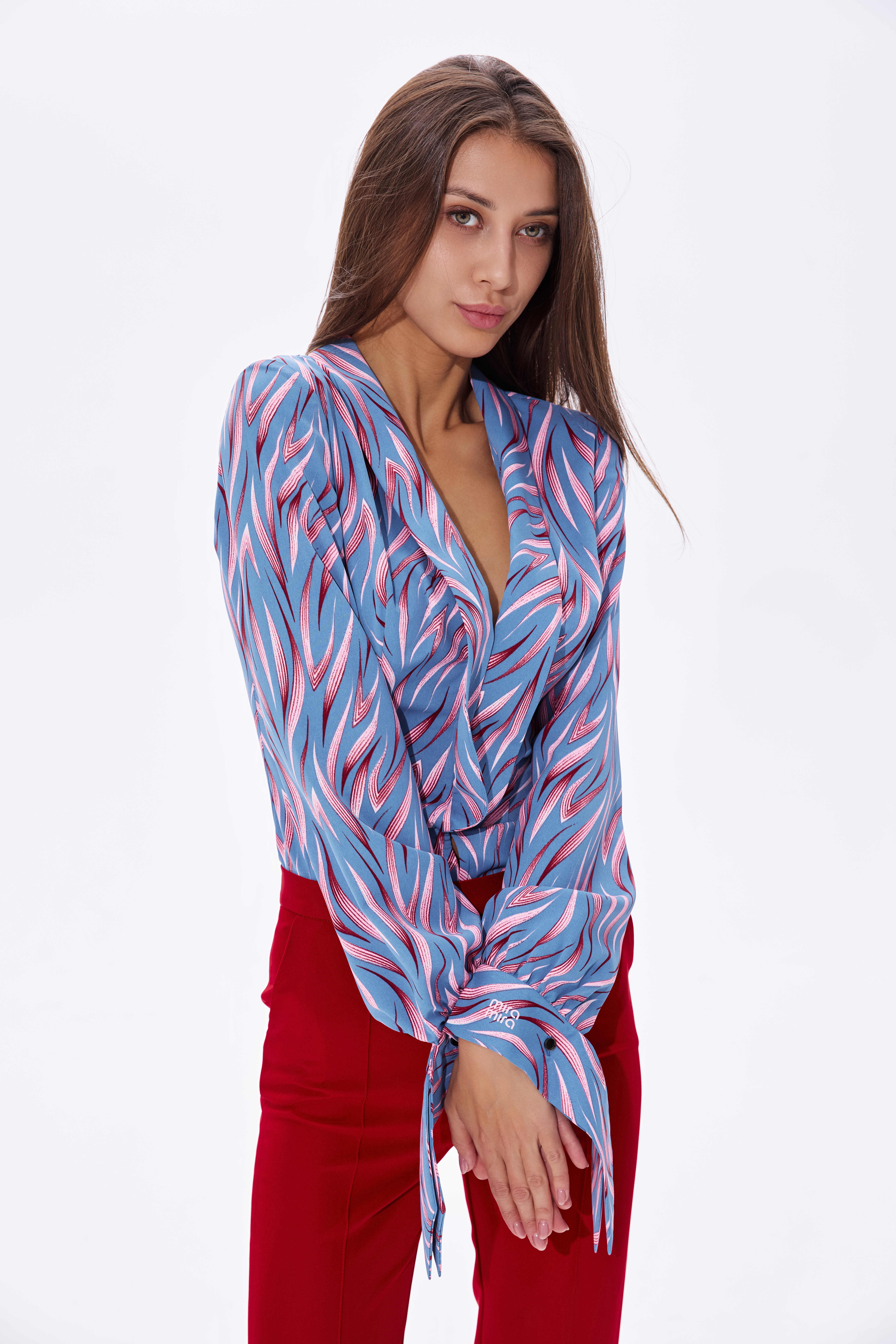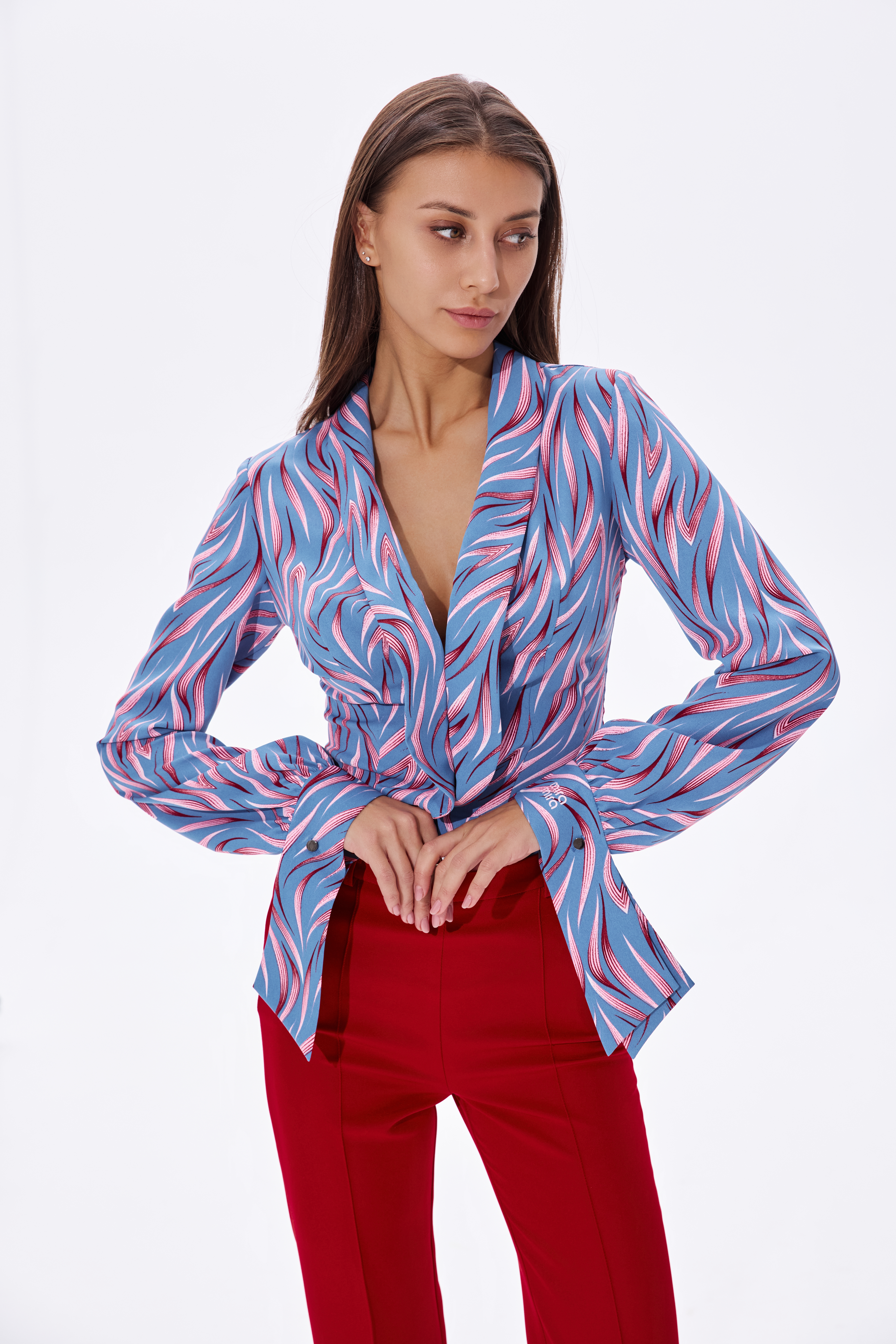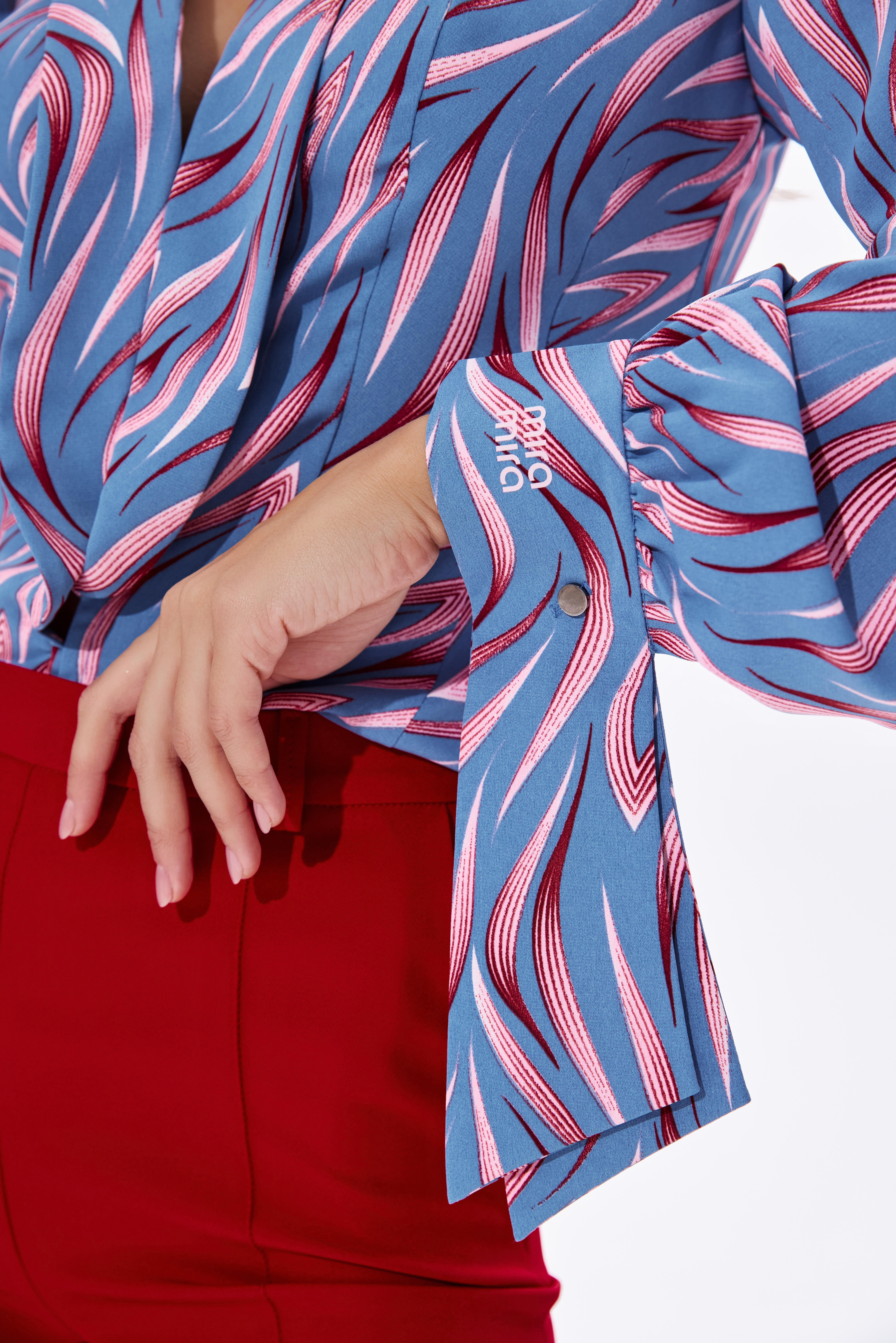 Элегантная рубашка приталенного силуэта с мягким акцентом на линию талии. Выполнена из лёгкой ткани с графичным цветочным принтом. Глубокий вырез и удлинённые манжеты создают утончённый, женственный образ. Подходит для офисных луков, вечерних выходов и повседневных сочетаний с джинсами или классическими брюками.