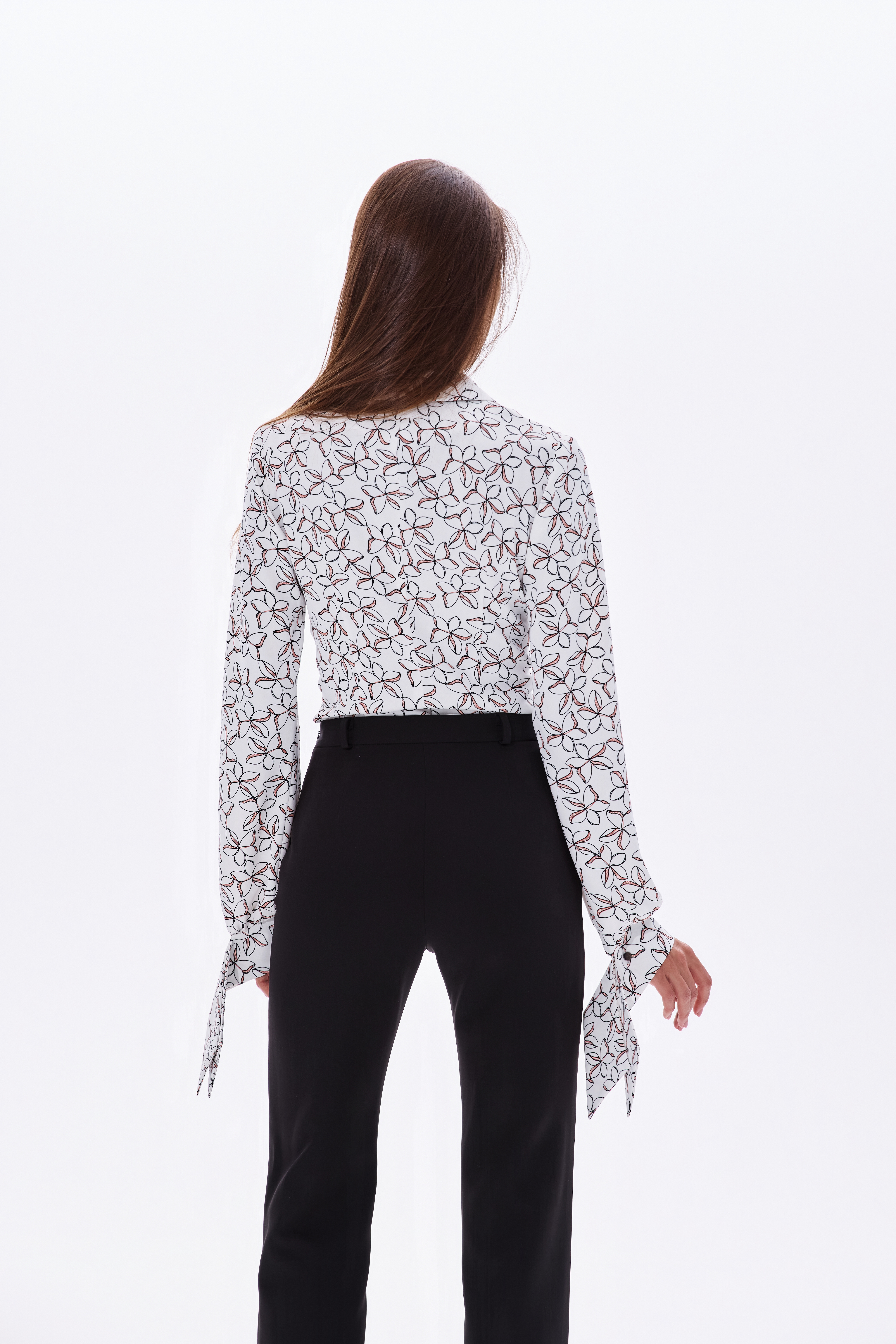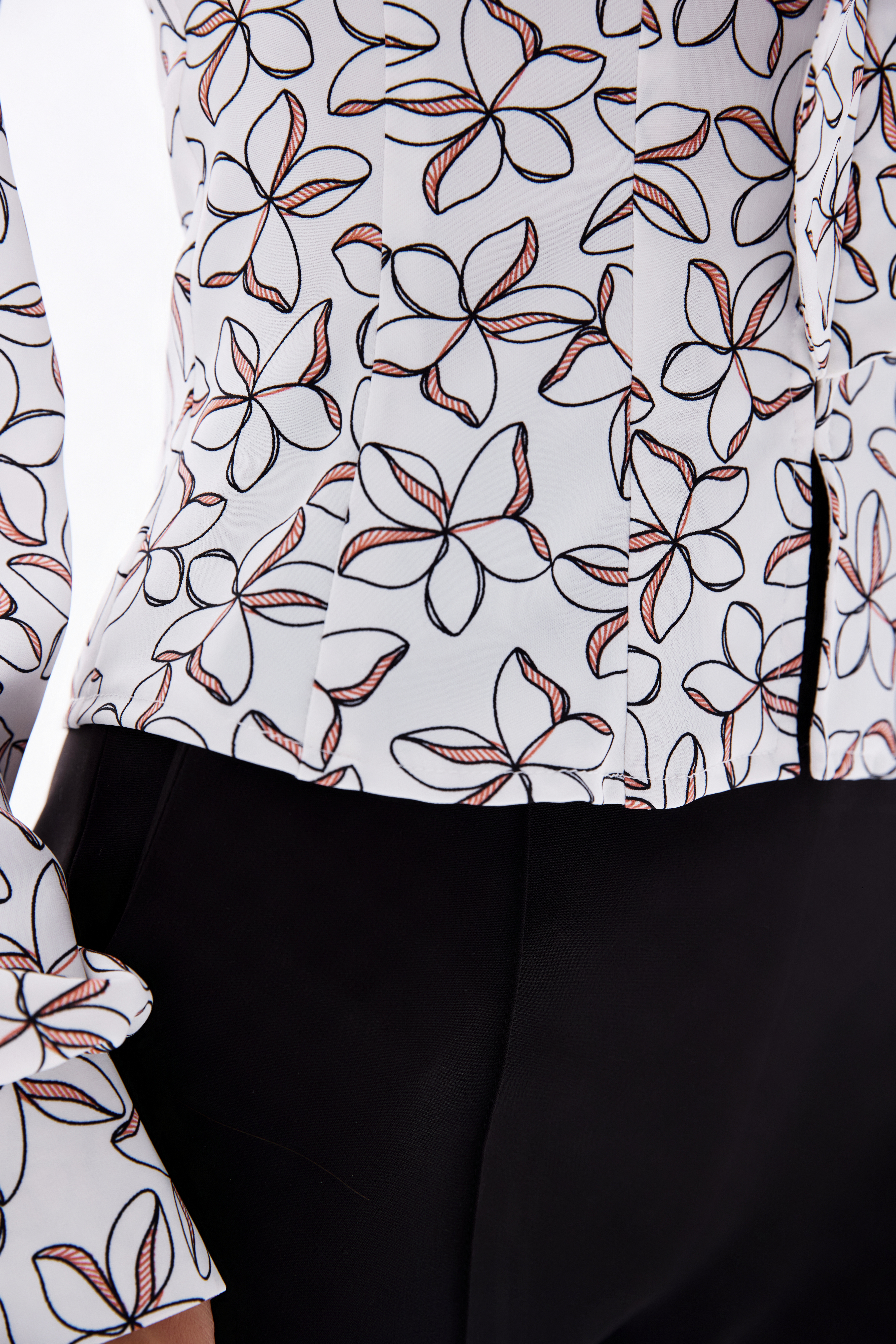 Элегантная рубашка приталенного силуэта с мягким акцентом на линию талии. Выполнена из лёгкой ткани с графичным цветочным принтом. Глубокий вырез и удлинённые манжеты создают утончённый, женственный образ. Подходит для офисных луков, вечерних выходов и повседневных сочетаний с джинсами или классическими брюками.