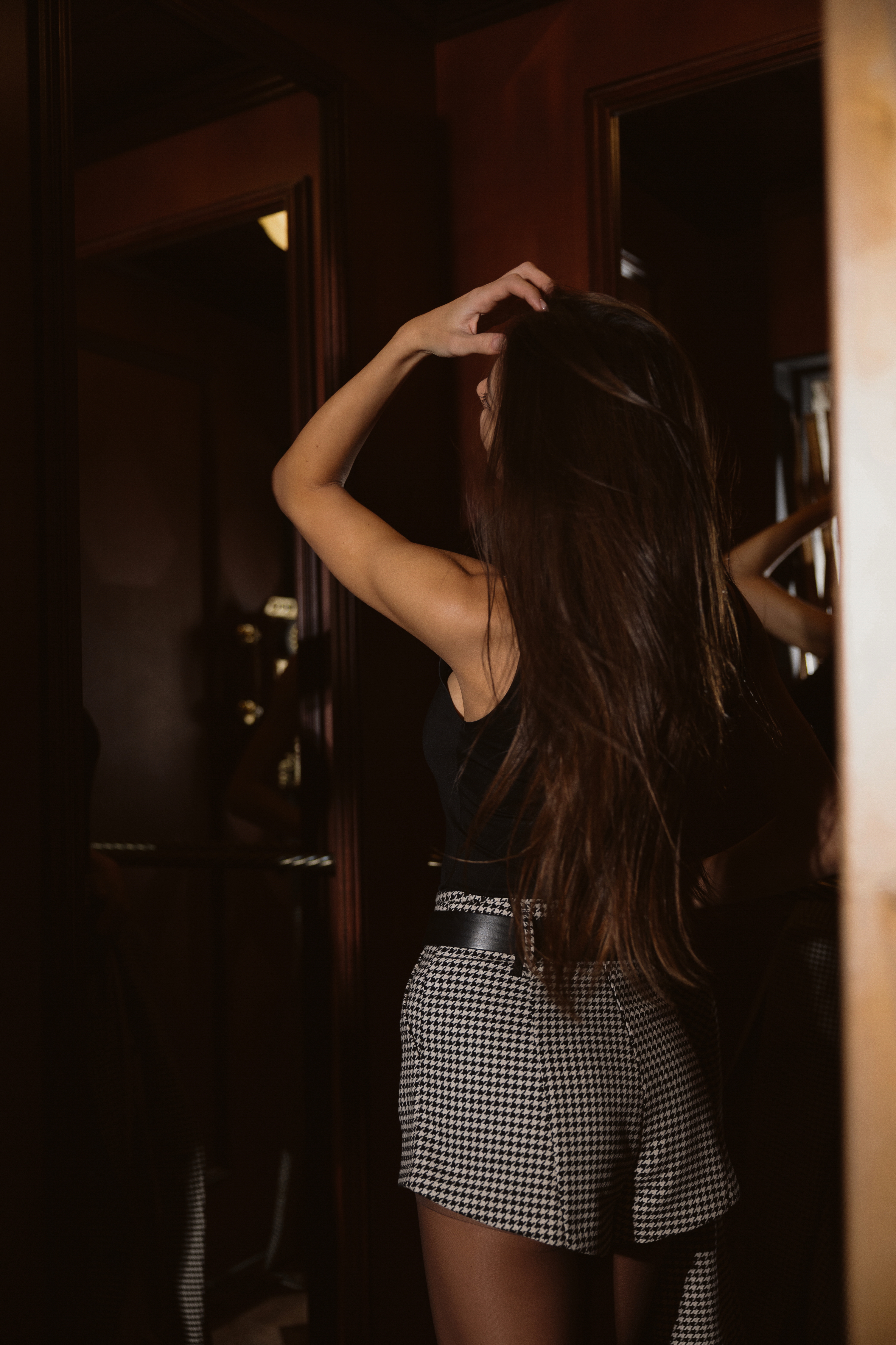 Шорты укороченные гусиная лапка отличное дополнение к стильному образу.Смелое решение для самых уверенных девушек. Мягкая костюмная ткань и два варината штрипок для широкого ремешка придают изделию индивидуальность.