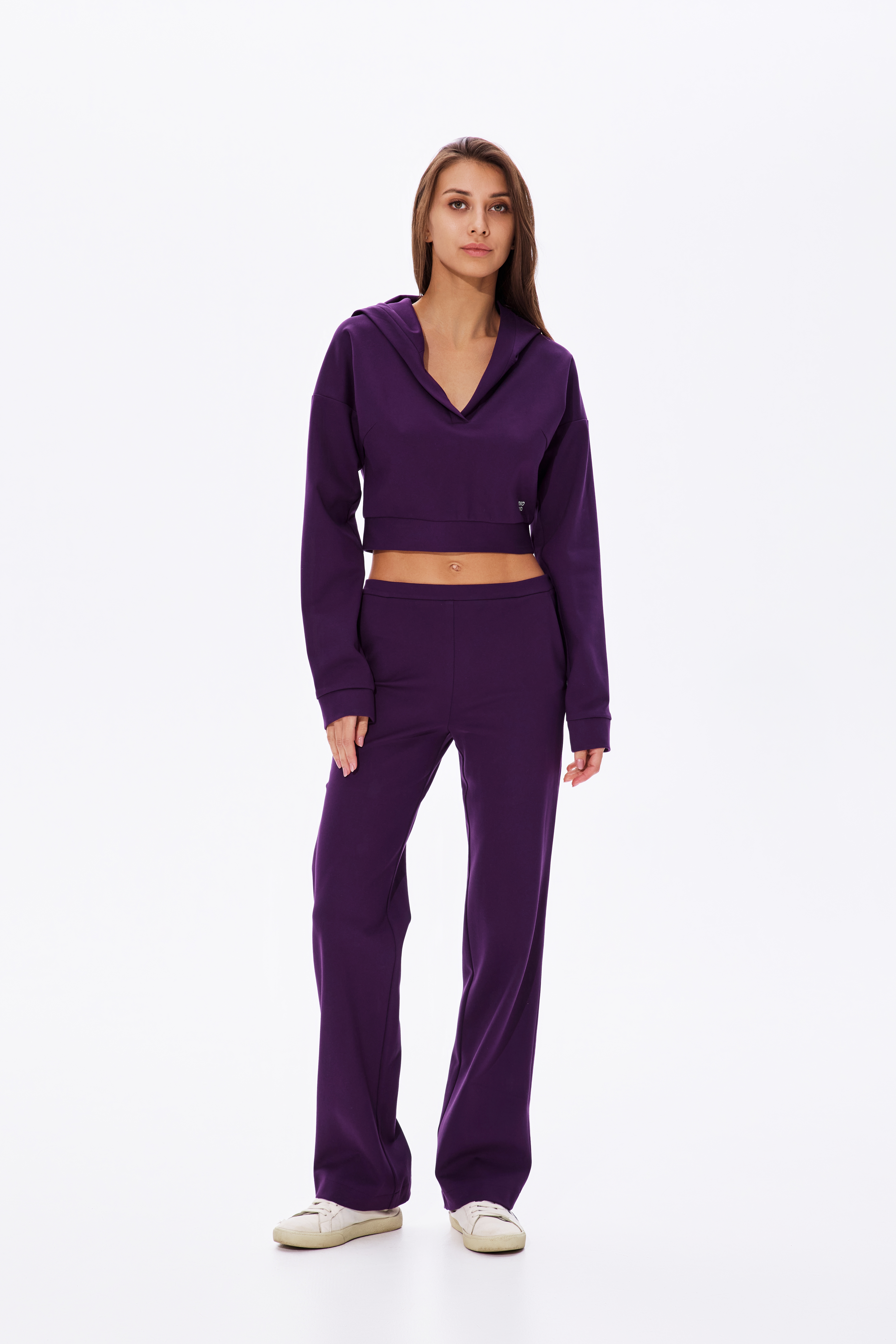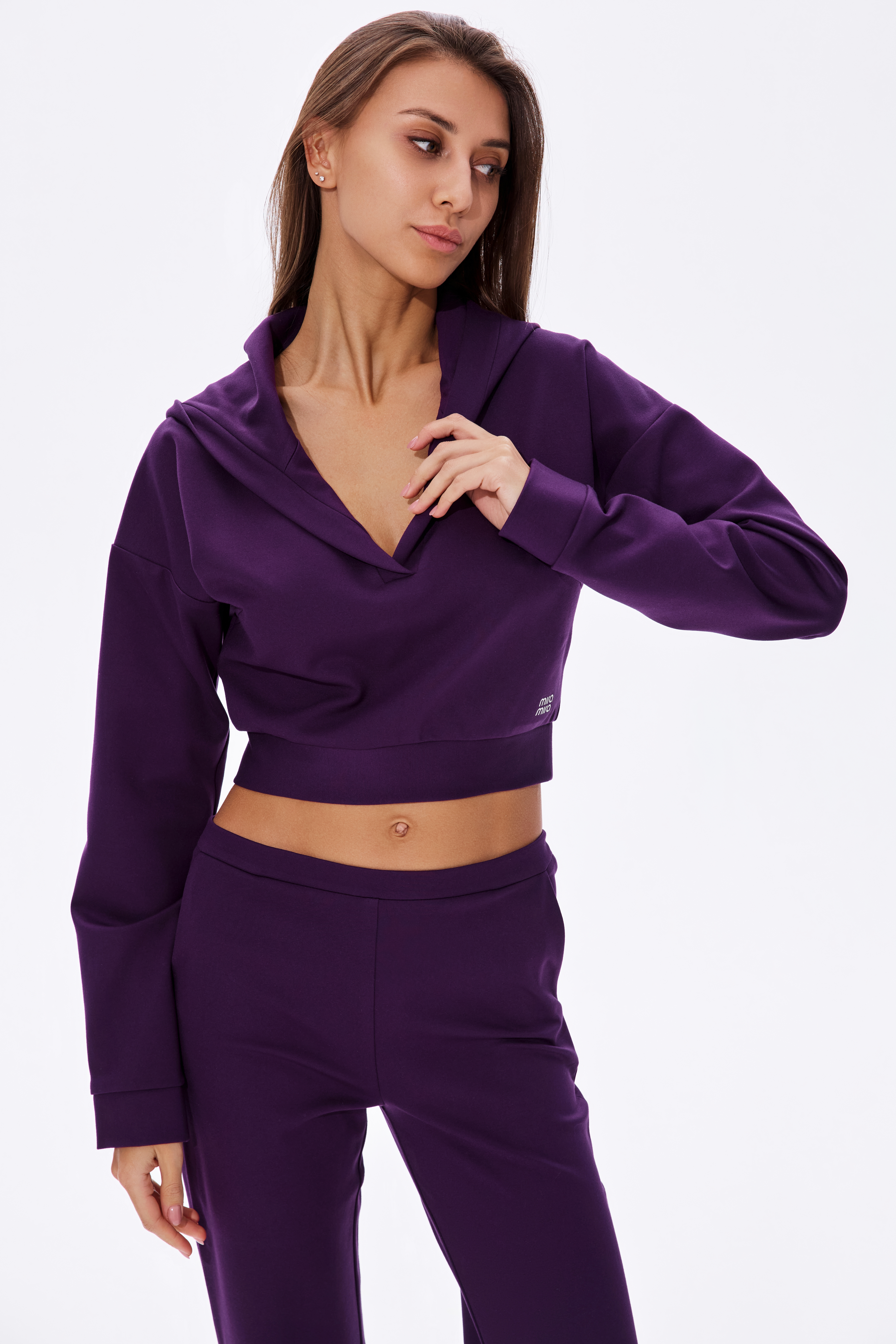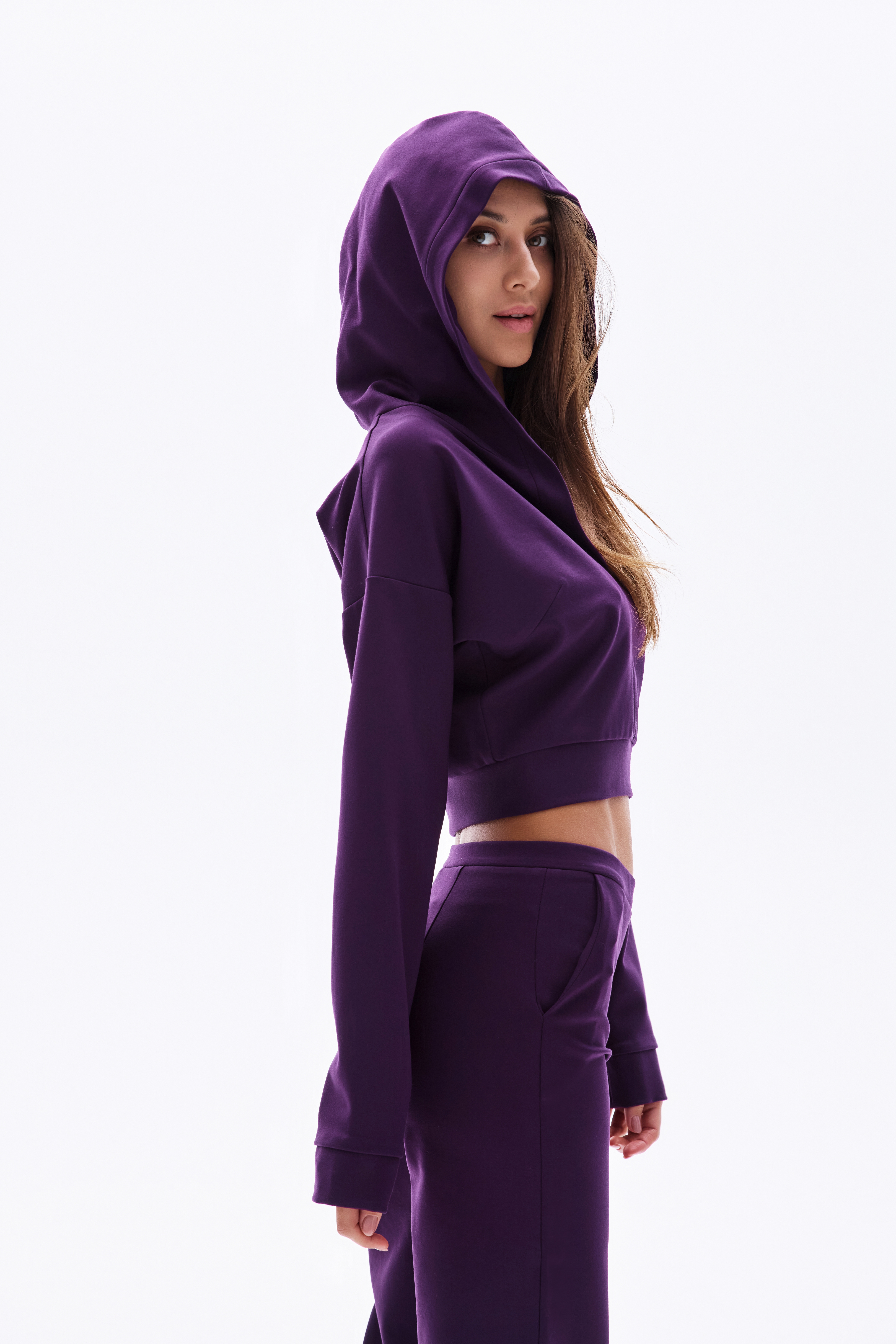 Яркая кофта из мягкого джерси в насыщенном цвете слива - стильный акцент в повседневном образе. Укороченный крой подчеркивает талию, а объемный капюшон добавляет расслабленного уюта. Универсальная модель, которая гармонично сочетается со спортивными штанами и юбкой.