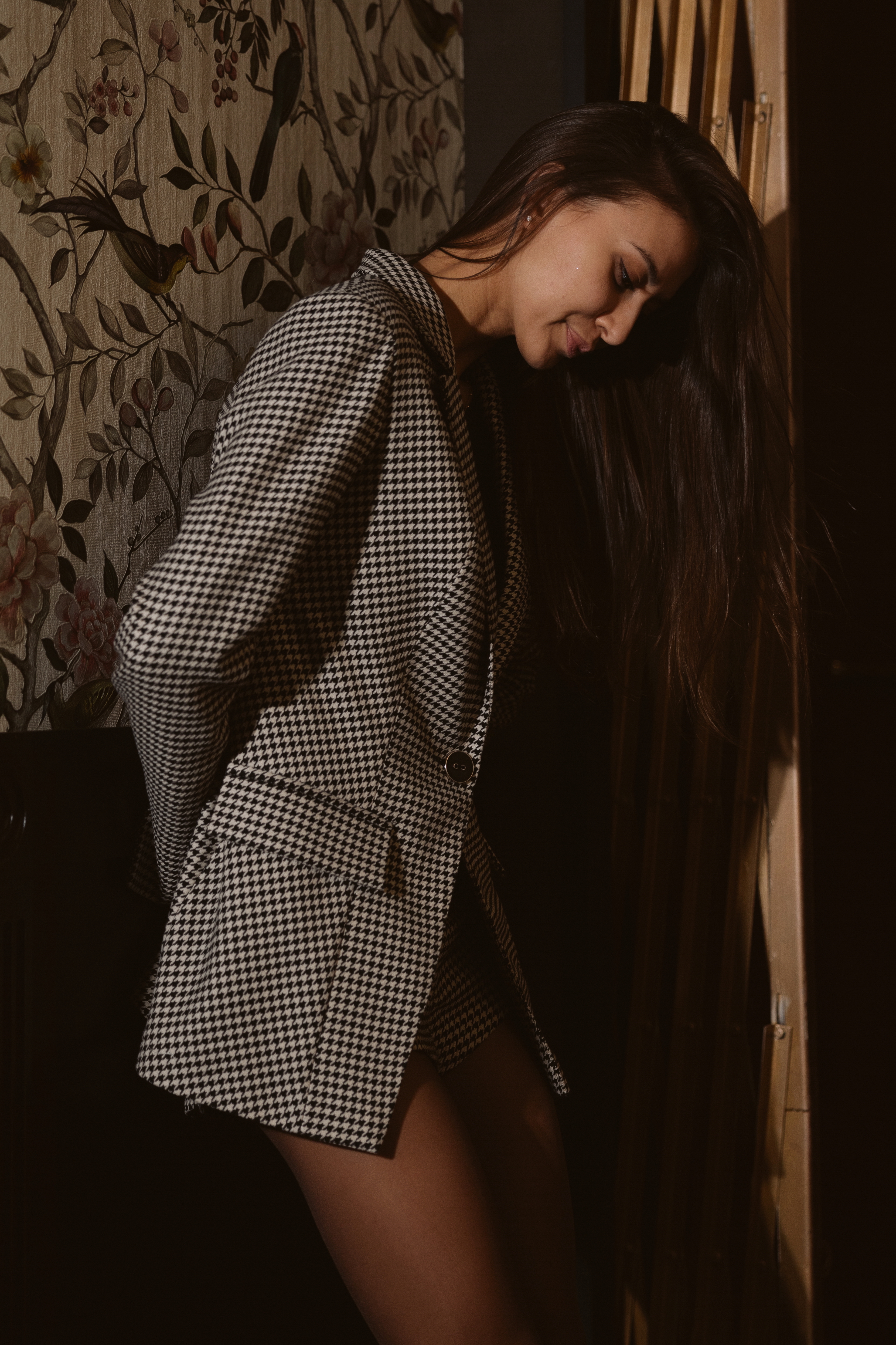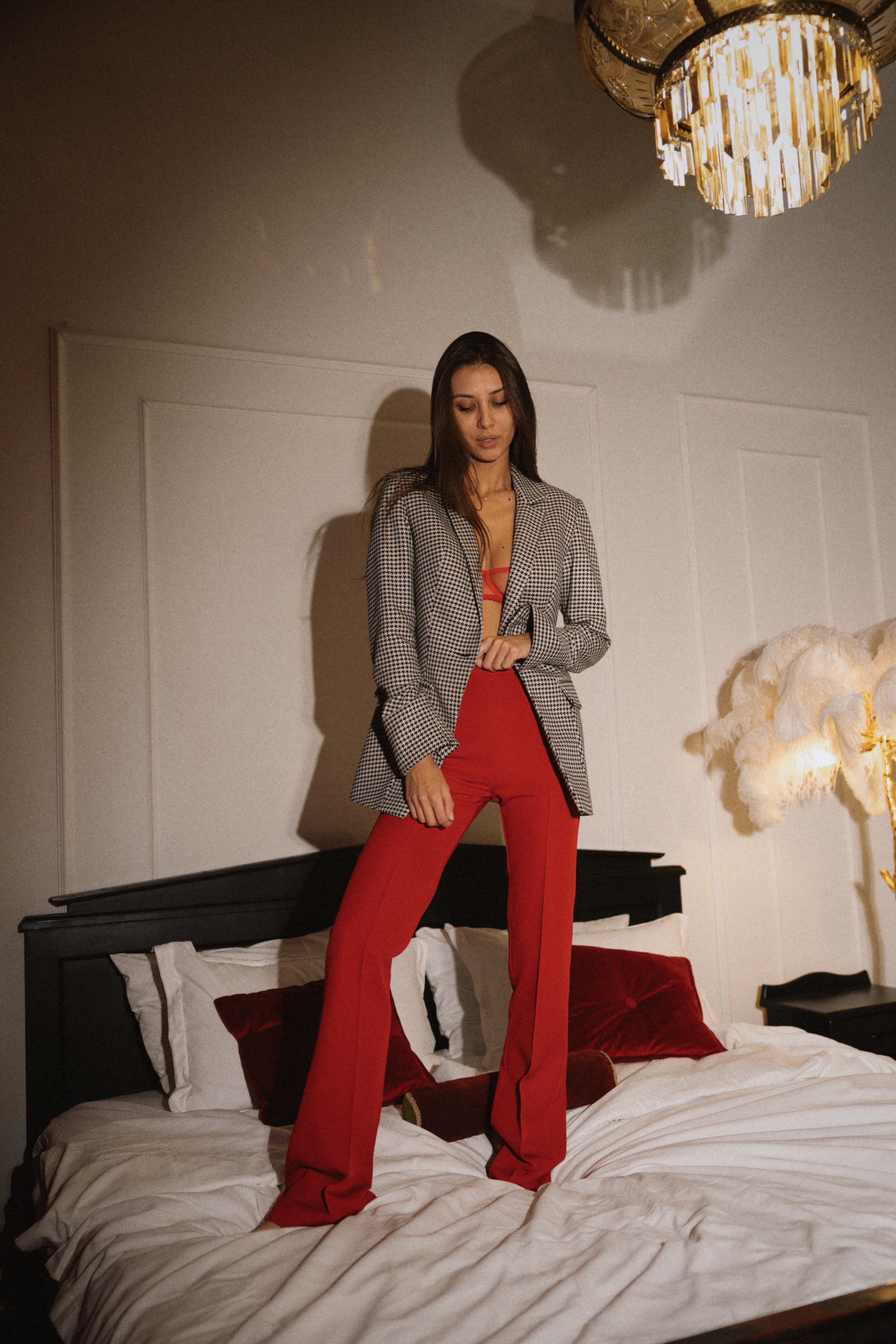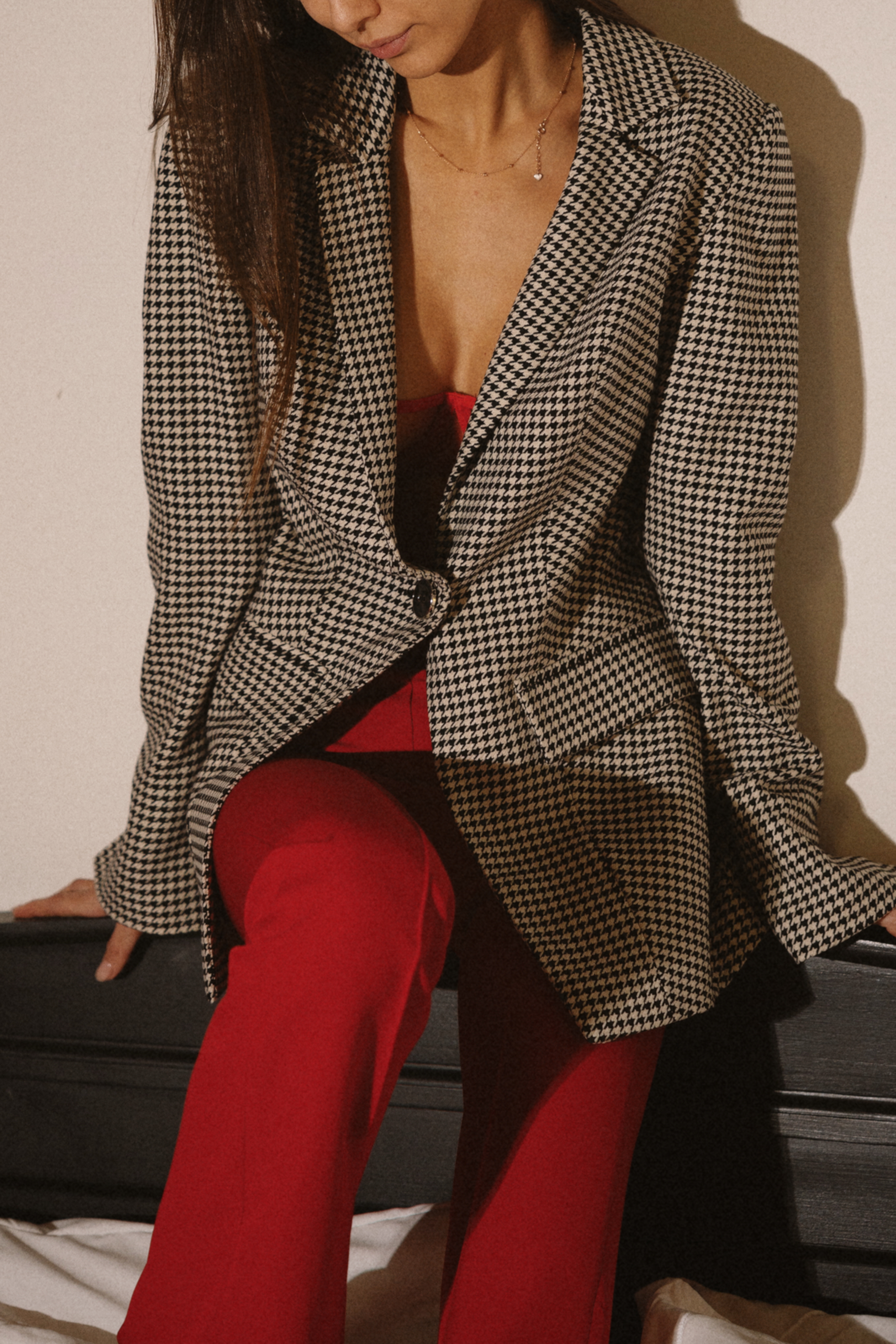 Жакет приталенного кроя на одной пуговице. Принт гусиная лапка, длина жакета ниже бедер. Красивое сочетание с шортами из этой же серии или классическими брюками прямого кроя в черном и красном цветах.